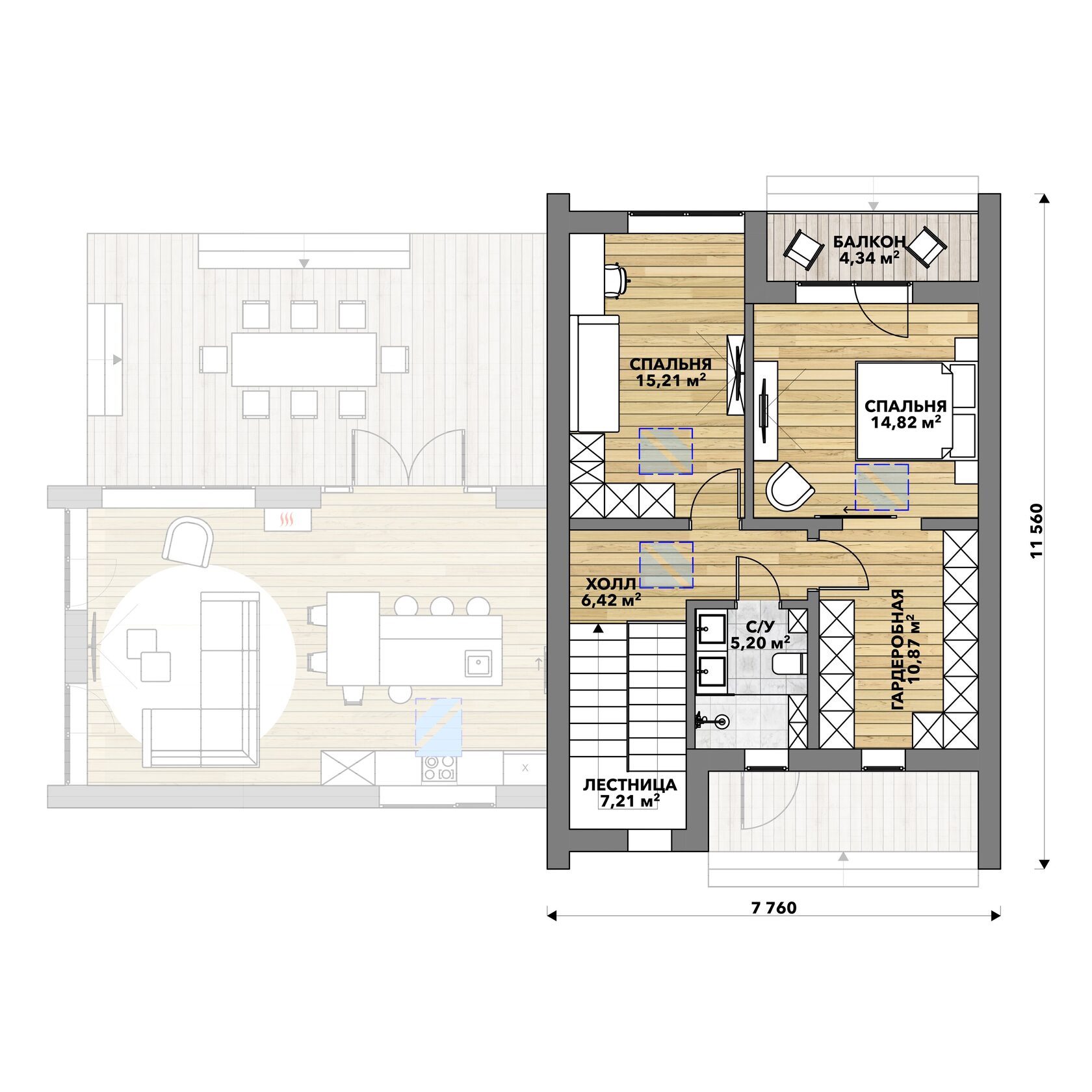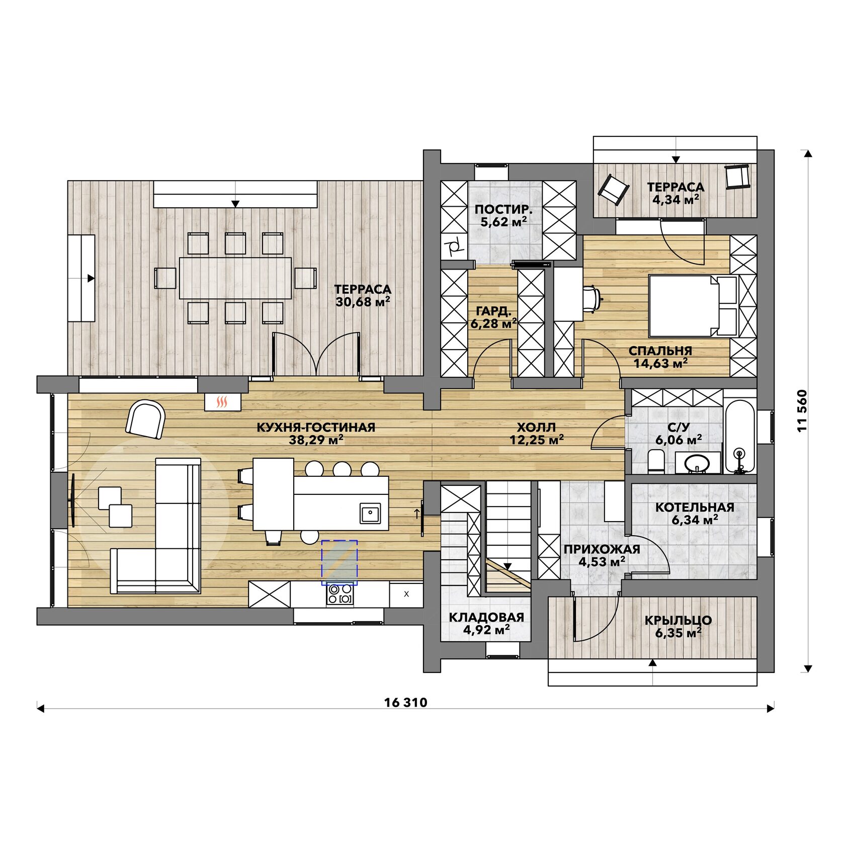 Проект двухэтажного дома в стиле барнхаус общей площадью 204м2 в коттеджном посёлке «Ильинка» с визуально интересным и стильным планировочным решением, а также с большим количеством окон