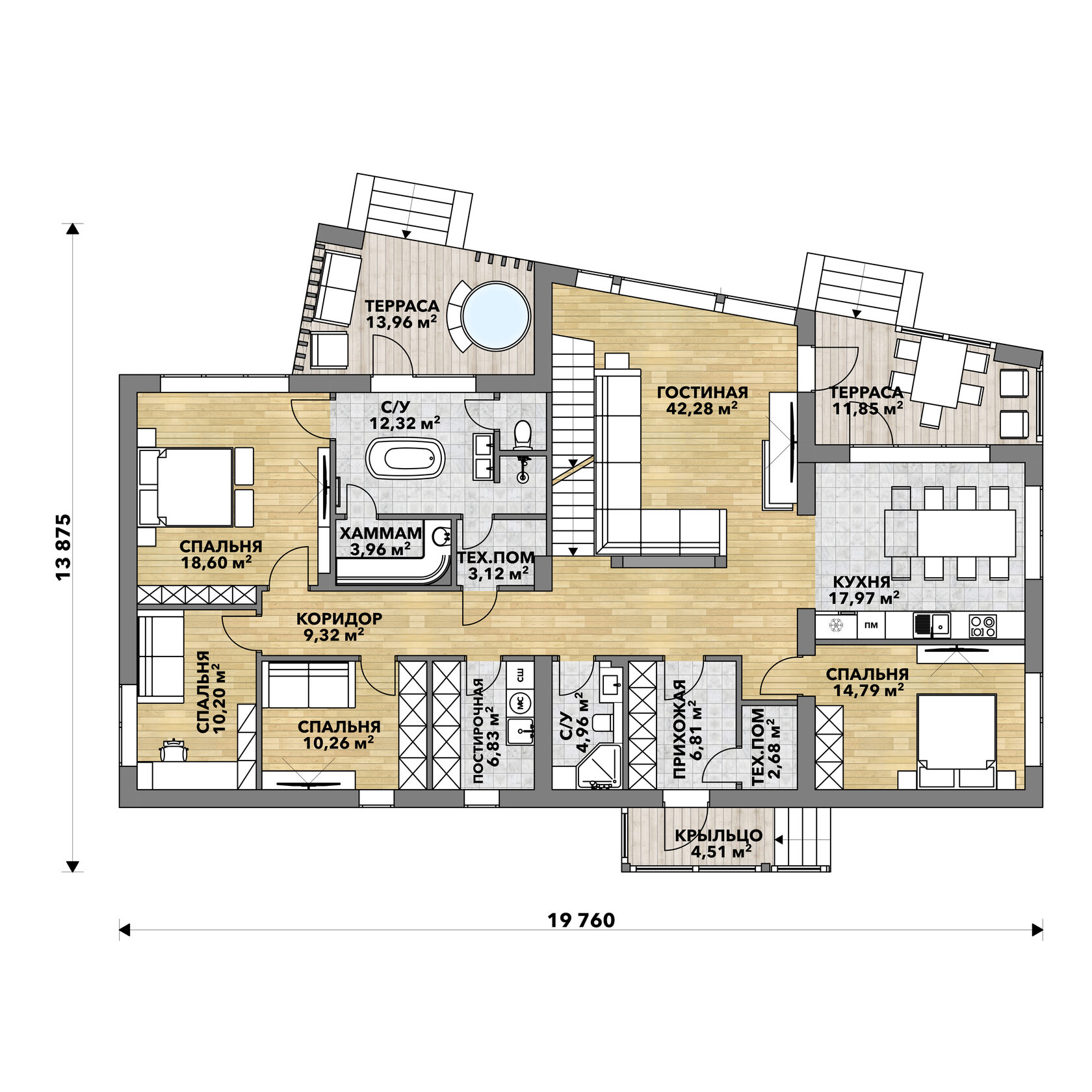 Проект двухэтажного дома в стиле барнхаус общей площадью 250м2 в коттеджном посёлке «Бристоль» с панорамными двухэтажными окнами и уютной террасой с барбекю зоной для веселых и теплых семейных вечеров