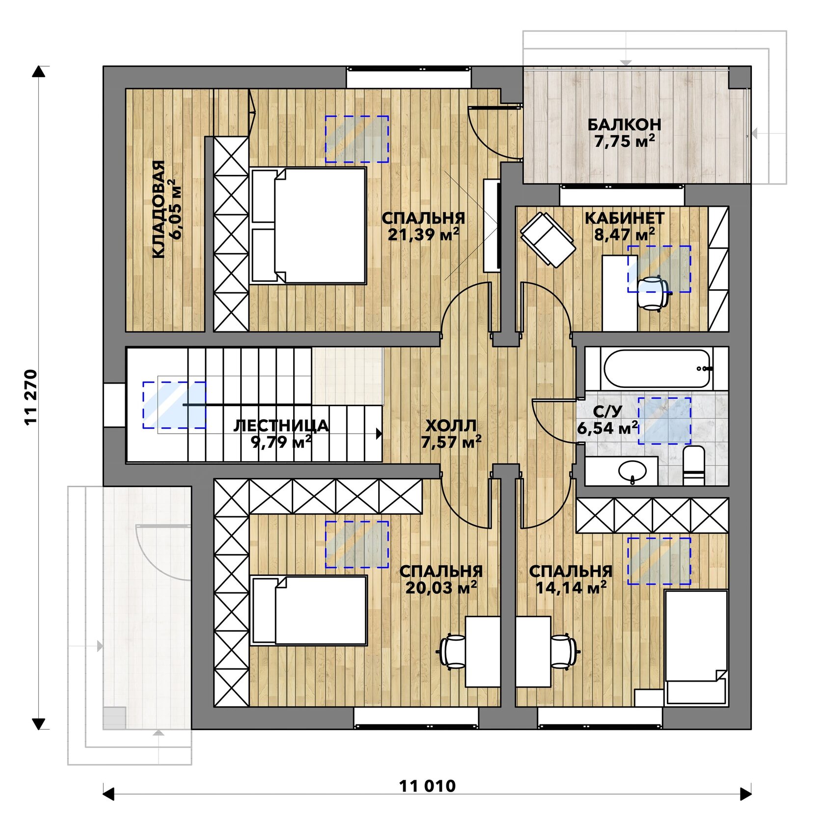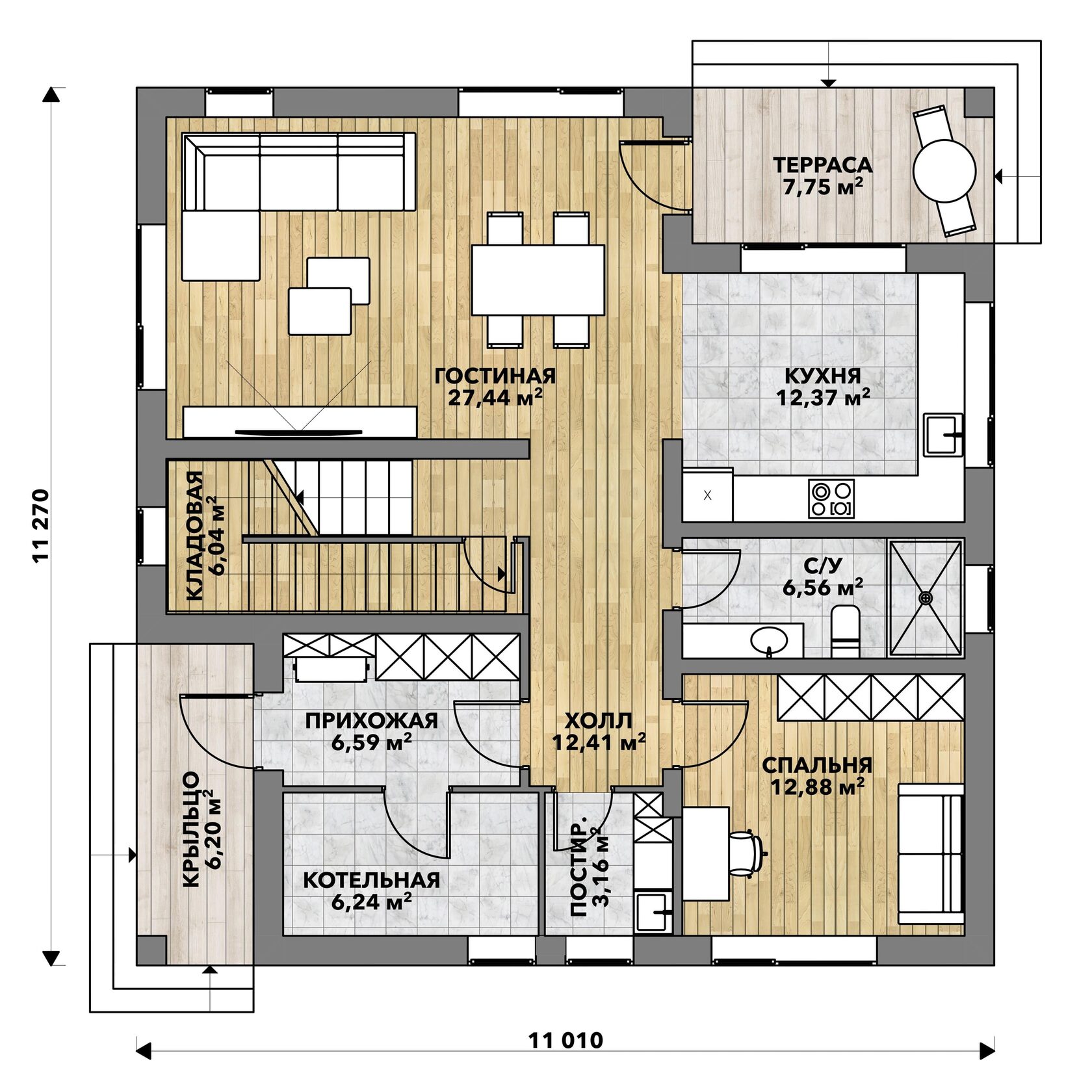 Проект двухэтажного дома в стиле барнхаус общей площадью 209м2 в коттеджном посёлке «Никольское» с кипельным вставками на фасаде и уютной планировкой и панорамными окнами на втором этаже