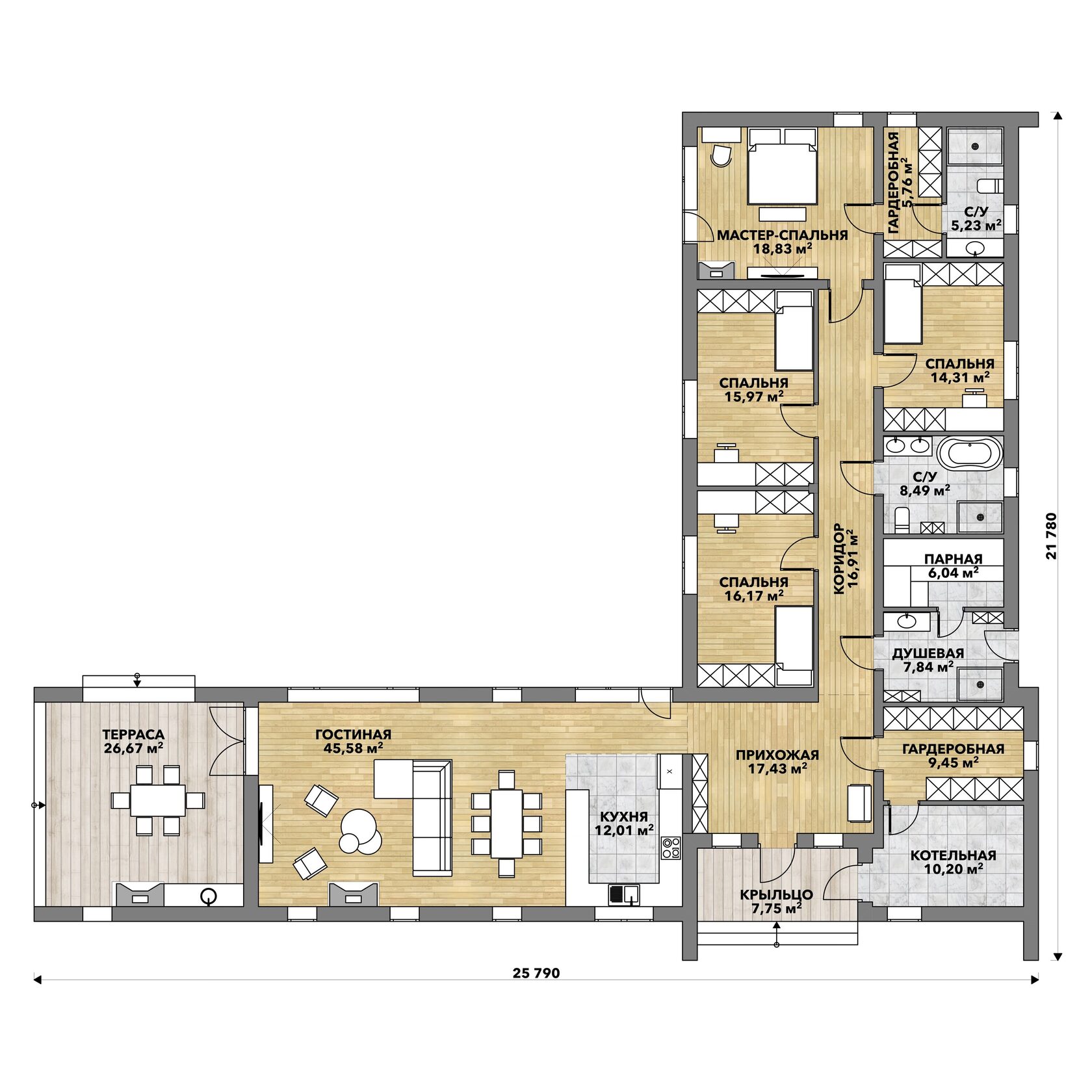 Архитектурно-планировочное решение: - На первом этаже располагаются четыре спальни, гардероб, коридор, парная, санузлы, прихожая, гостиная, кухня и терраса