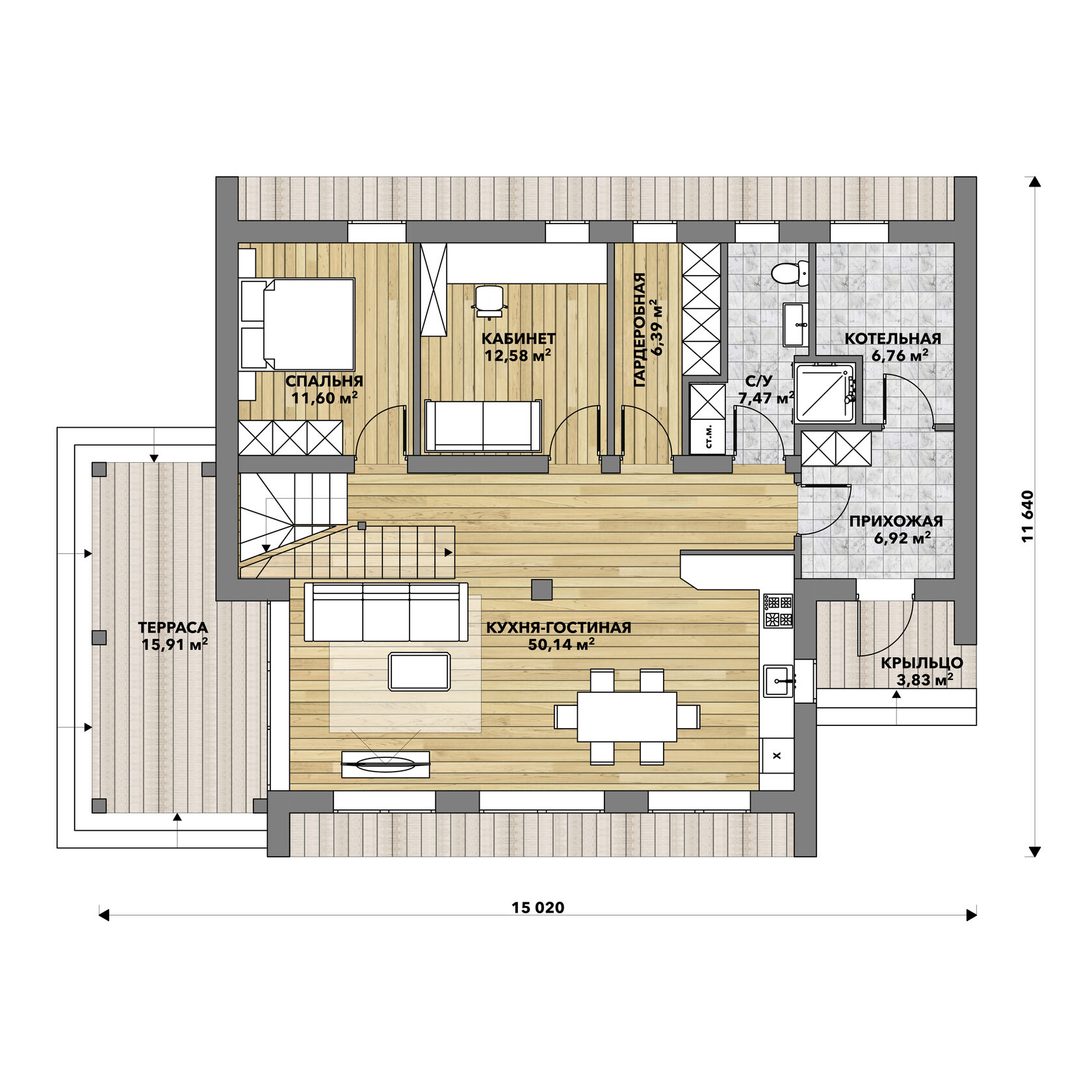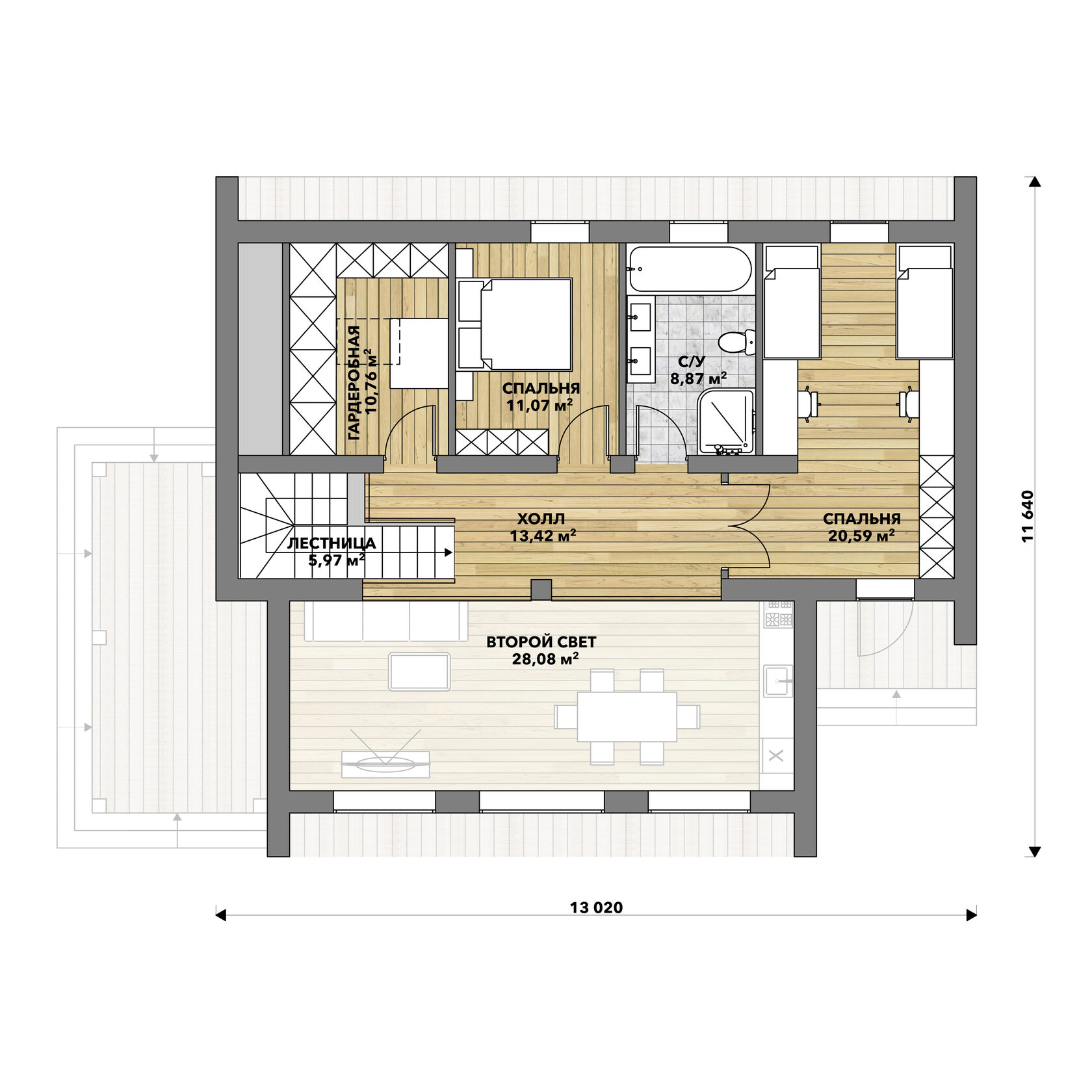 Архитектурно-планировочное решение: - На первом этаже располагаются терраса, спальня, кабинет, санузел и кухня-гостиная - На втором этаже располагаются гардероб, две спальни, холл, санузел и второй свет