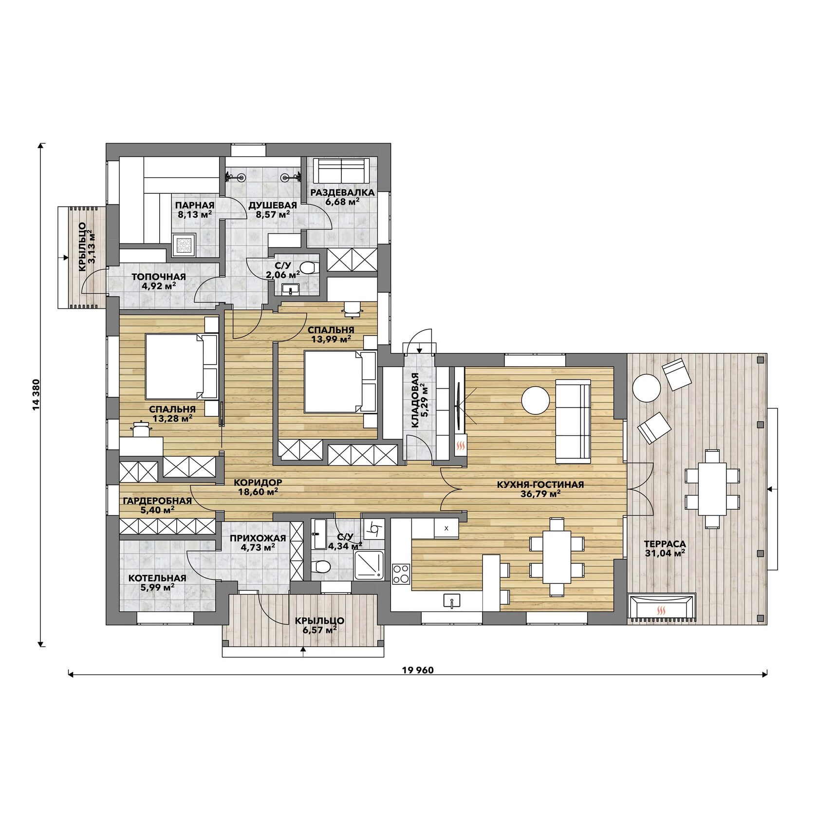 Архитектурно-планировочное решение: - На первом этаже располагаются сауна, две спальни, санузел, гардероб, коридор, кухня гостиная и терраса