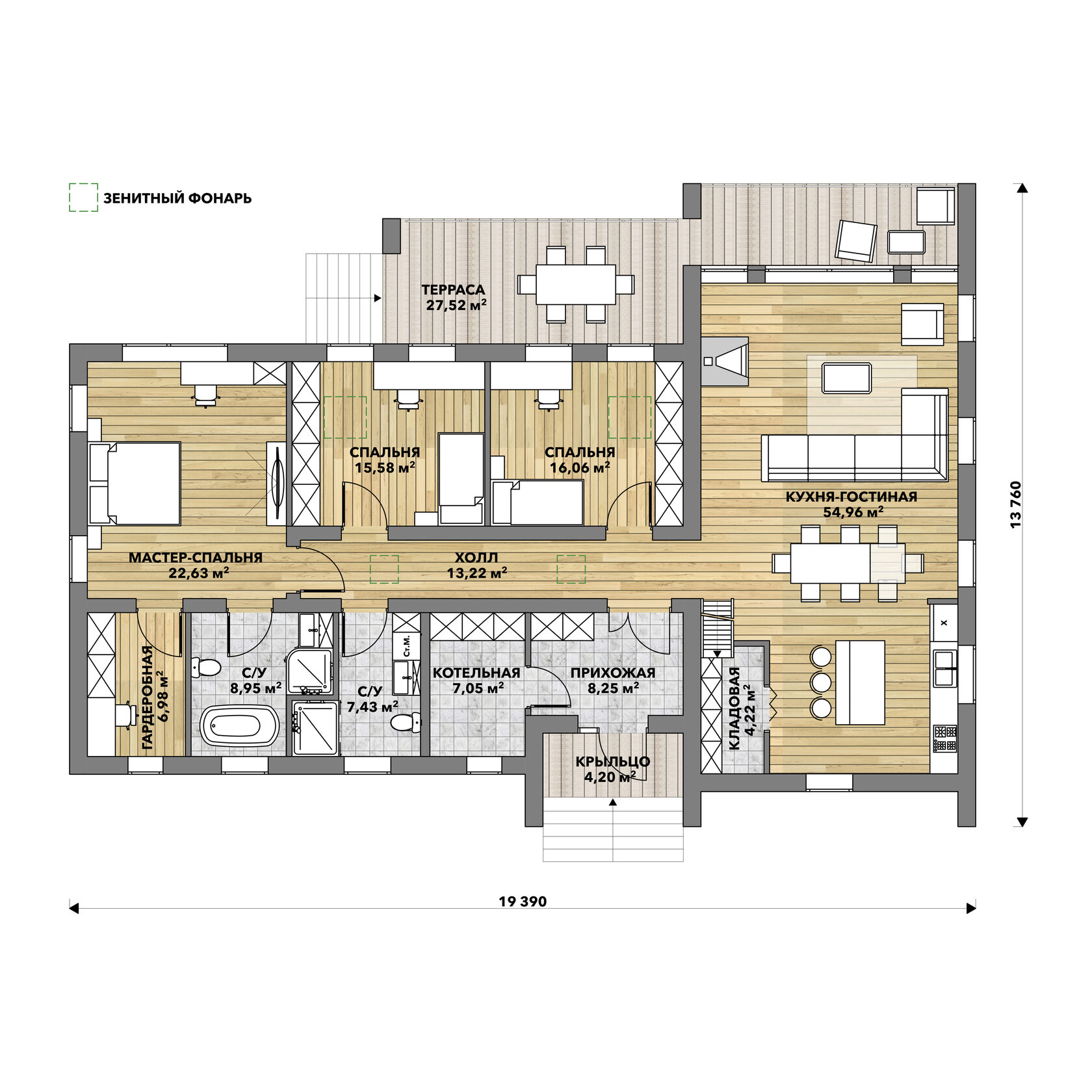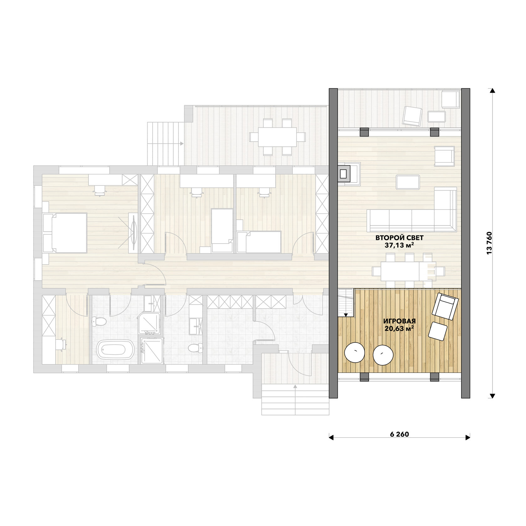 Архитектурно-планировочное решение: - На первом этаже располагаются три спальни, кухня гостиная, гардероб, санузлы и терраса - На втором этаже располагаются игровая и второй свет