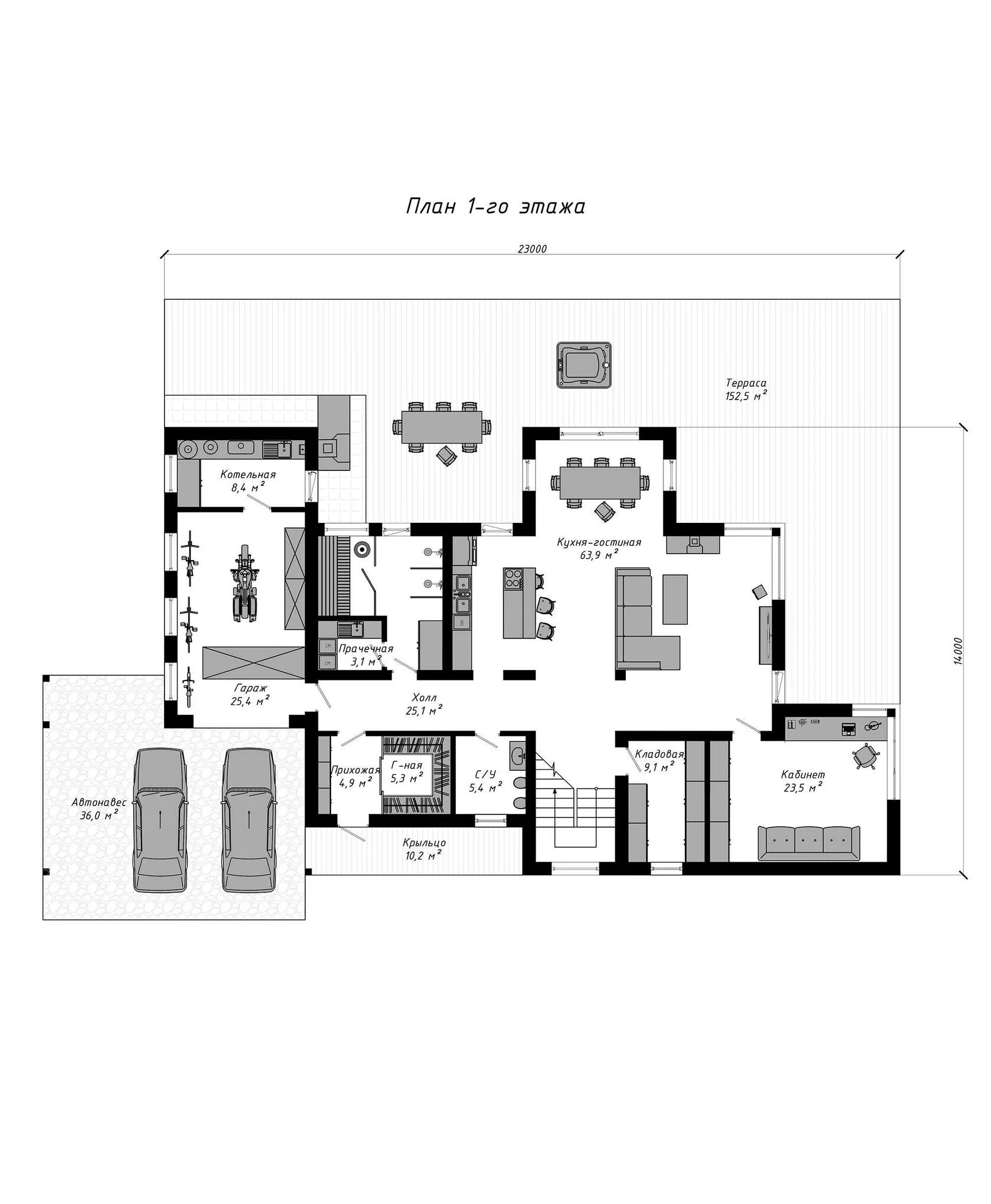 Проект двухэтажного дома в современном стиле общей площадью 290м2 в коттеджном посёлке «Зимний сад» с высокими потолками и панорамными окнами