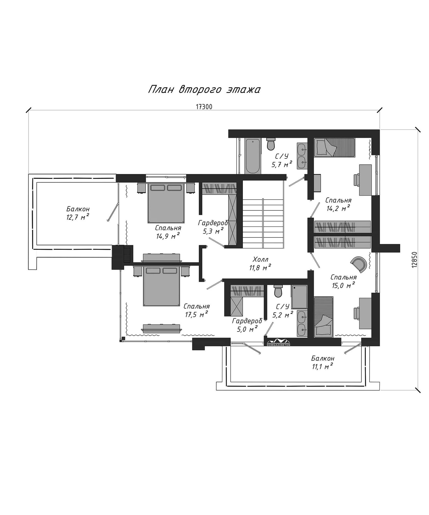 Архитектурно-планировочное решение: - На первом этаже располагаются терраса, веранда, кухня гостиная, гардероб, кабинет, санузел и спальня - На втором этаже располагаются два балкона, четыре спальни, холл, гардероб и санузлы
