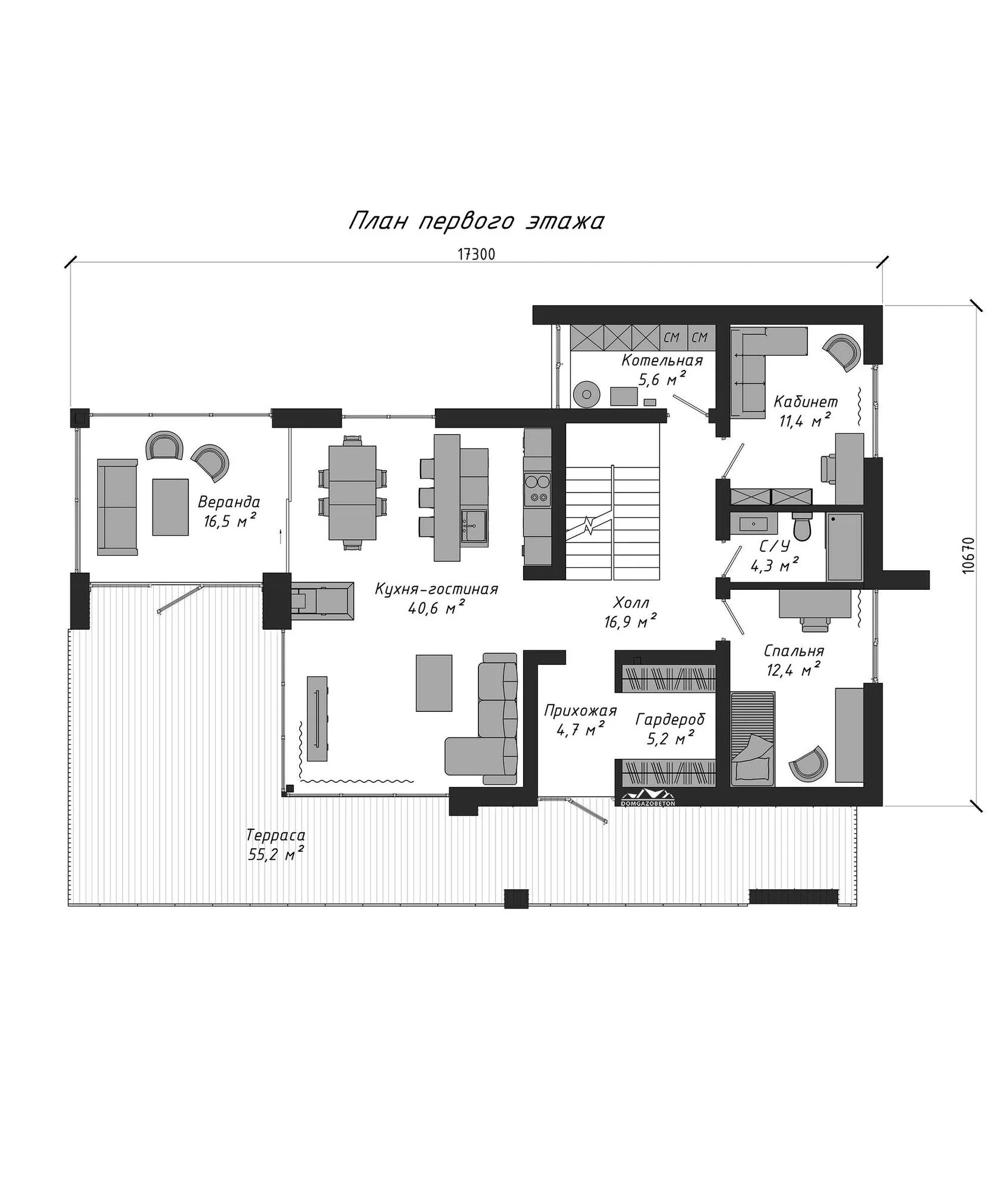Проект двухэтажного дома в современном стиле общей площадью 211м2 в коттеджном посёлке «Сколково town» с большой кухней-гостиной, террасой и двумя балконами