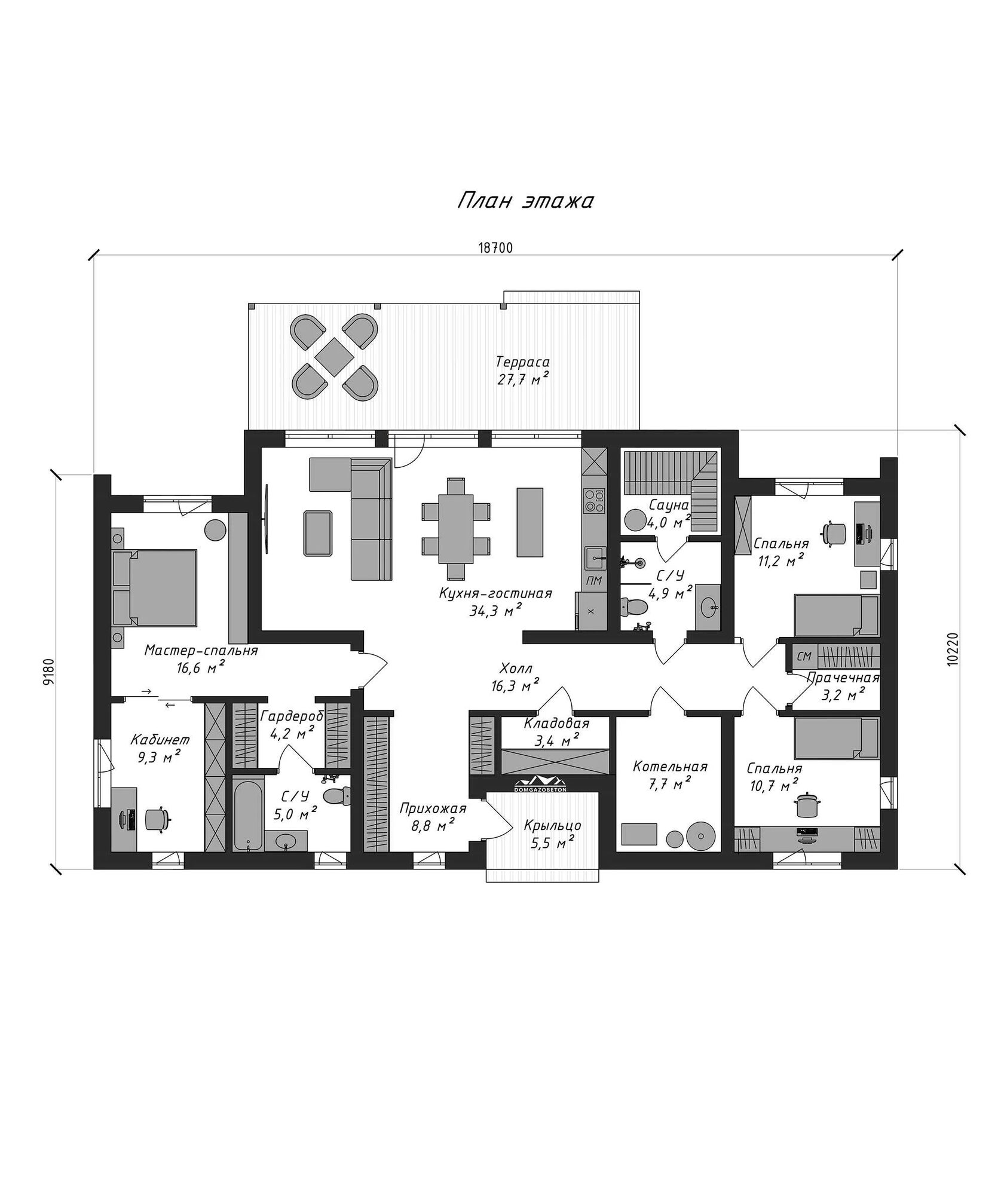 Архитектурно-планировочное решение: - На первом этаже располагаются кабинет, три спальни, сауна, кухня гостиная, прачечная и терраса