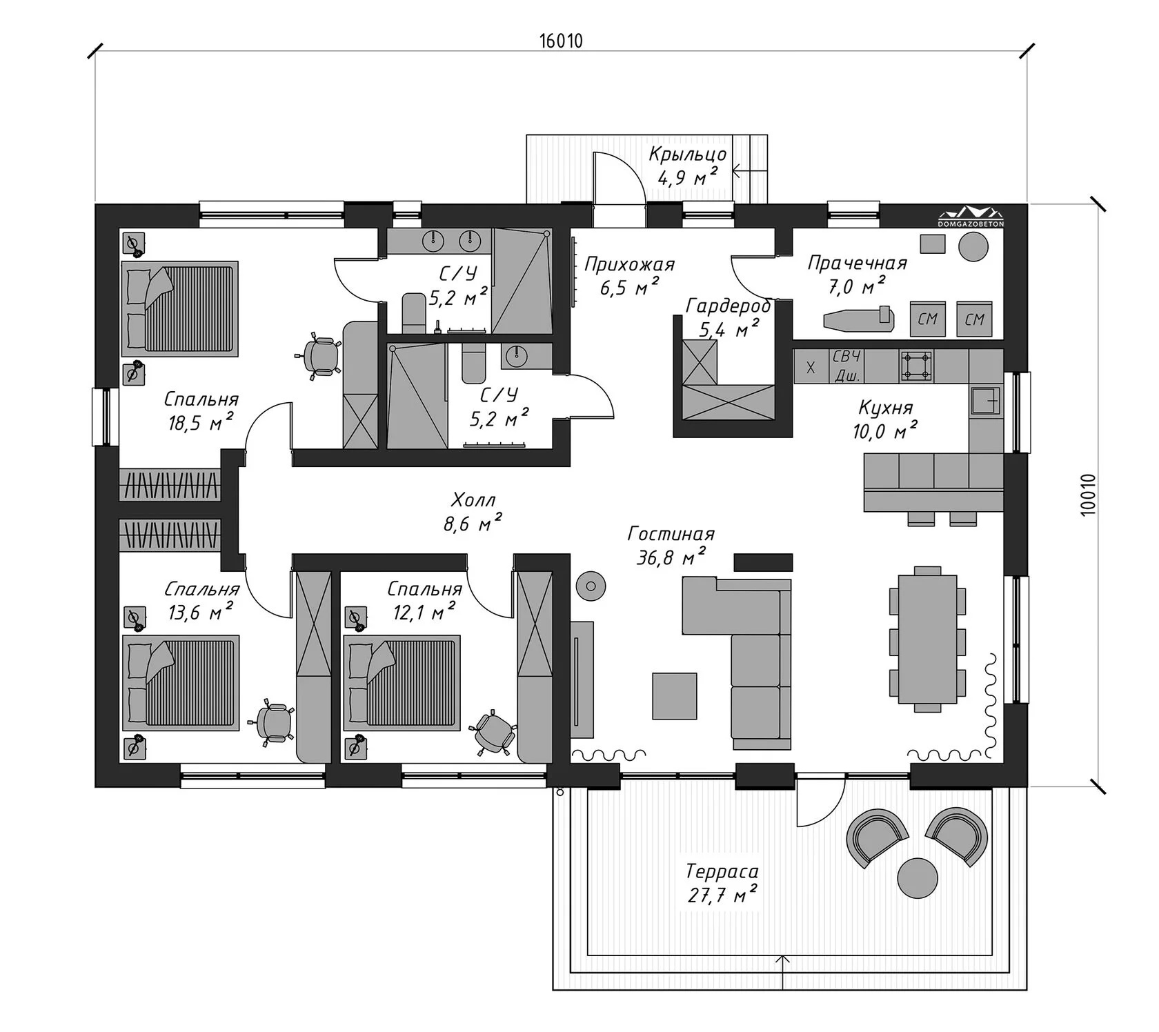 Проект одноэтажного дома в стиле барнхаус общей площадью 112м2 в коттеджном посёлке «Пушкино» с удобной планировкой с тремя спальнями и большой гостиной