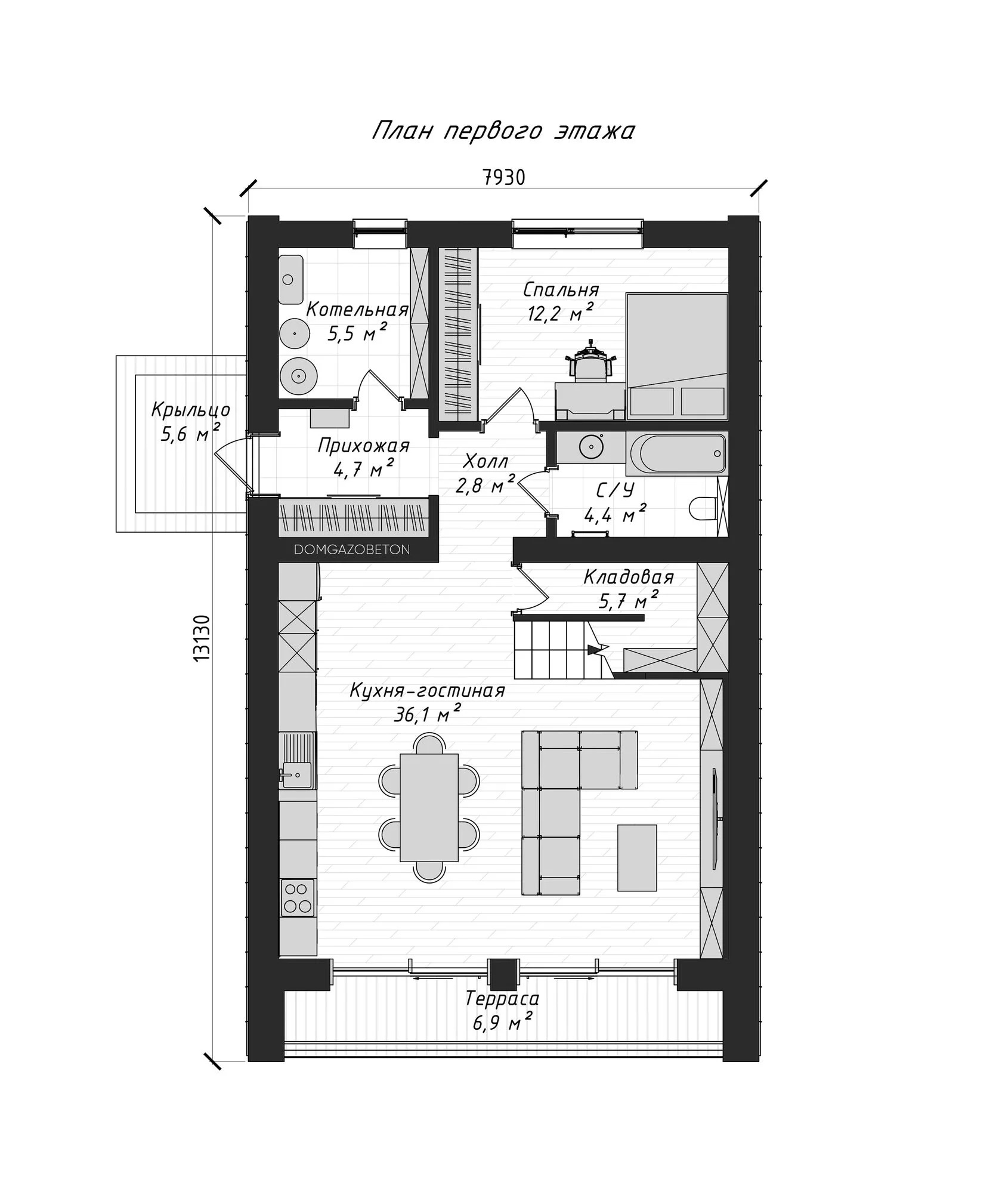 Проект двухэтажного дома в стиле барнхаус общей площадью 113м2 в коттеджном посёлке «Новое Румянцево» с высокими потолками и панорамными окнами