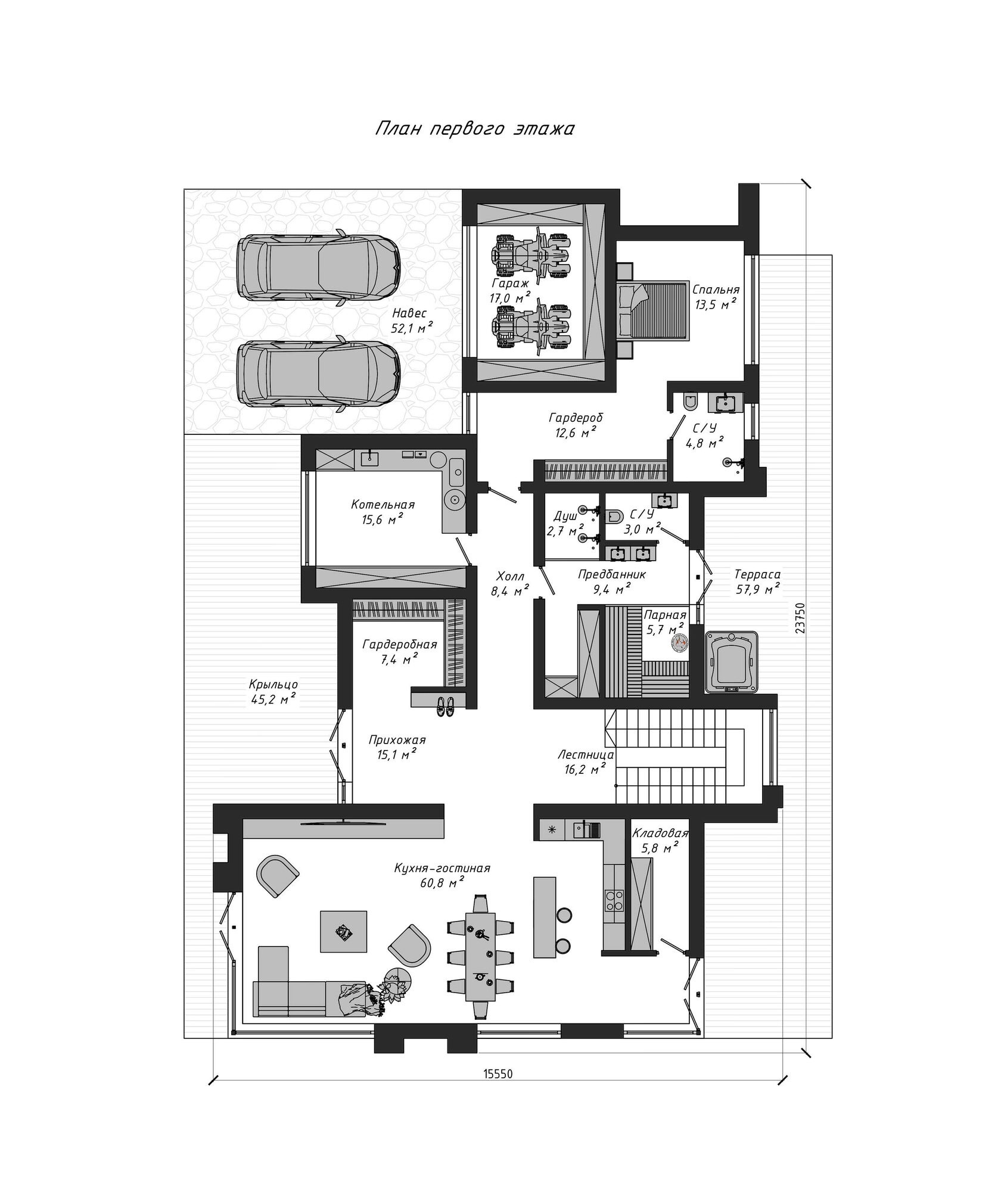 Проект двухэтажного дома в современном минималистическом стиле общей площадью 499м2 в коттеджном посёлке «Враздорах» с просторной и светлой планировкой и большой кухней гостиной