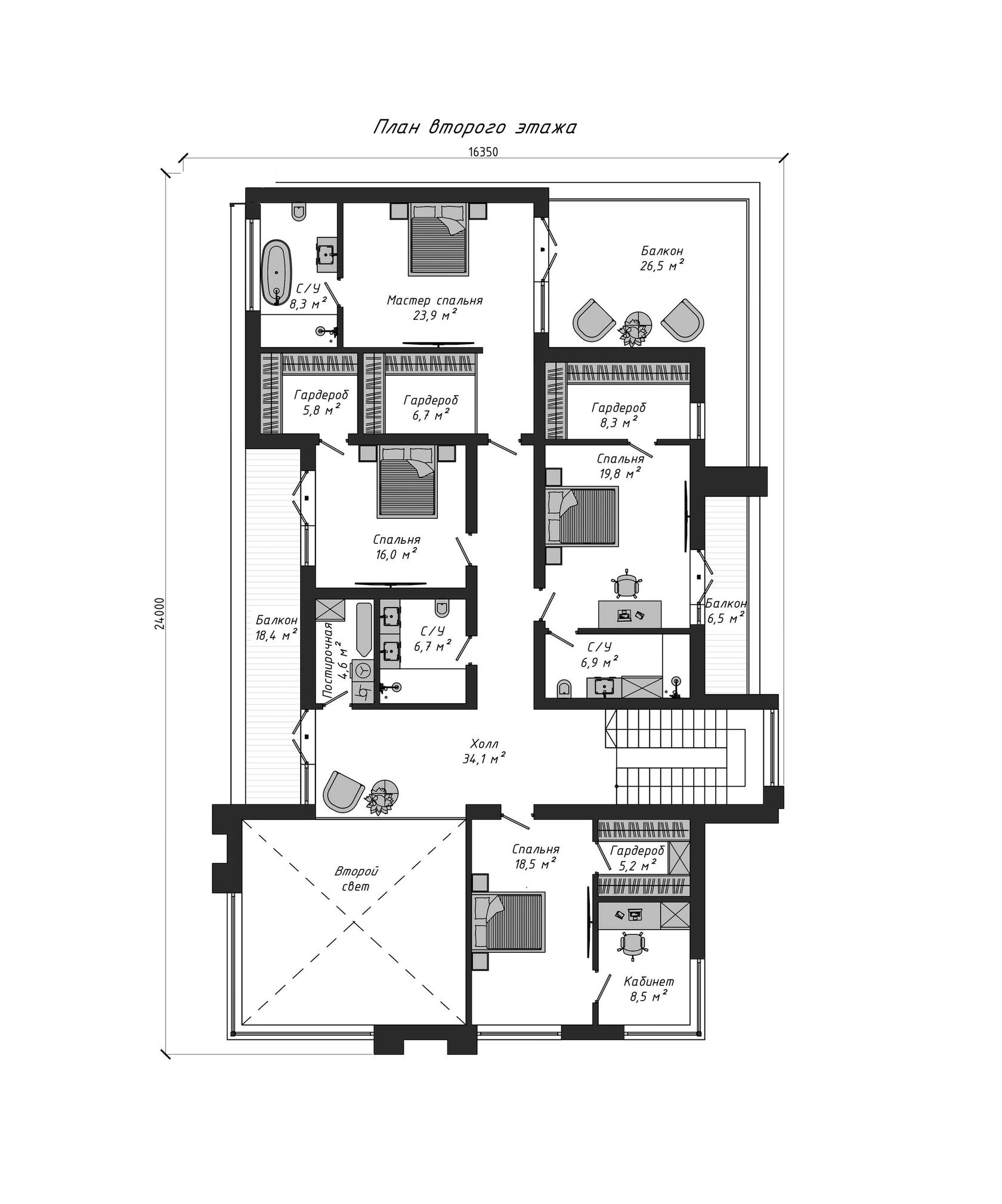 Архитектурно-планировочное решение: - На первом этаже располагаются гараж, спальня, гардероб, санузел, сауна, холл, кухня гостиная и кладовая - На втором этаже располагаются три спальни, два балкона, санузлы, гардеробы, кабинет и второй свет
