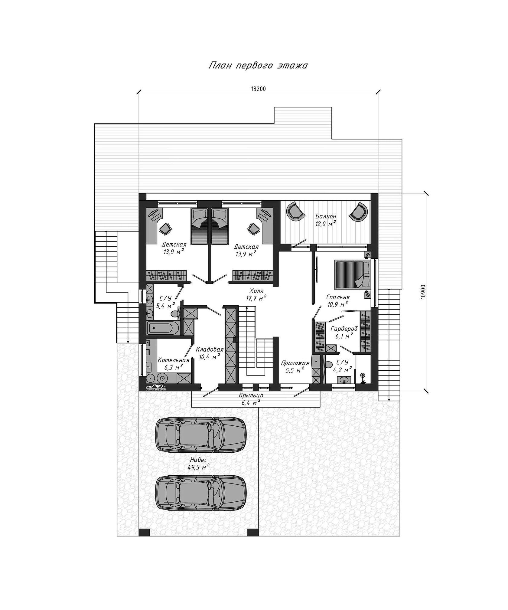 Архитектурно-планировочное решение: - На цокольном этаже располагаются терраса, кухня гостиная, холл, кабинет, спальня и сауна - На первом этаже располагаются две детские, холл, спальня, санузел и навес для автомобилей