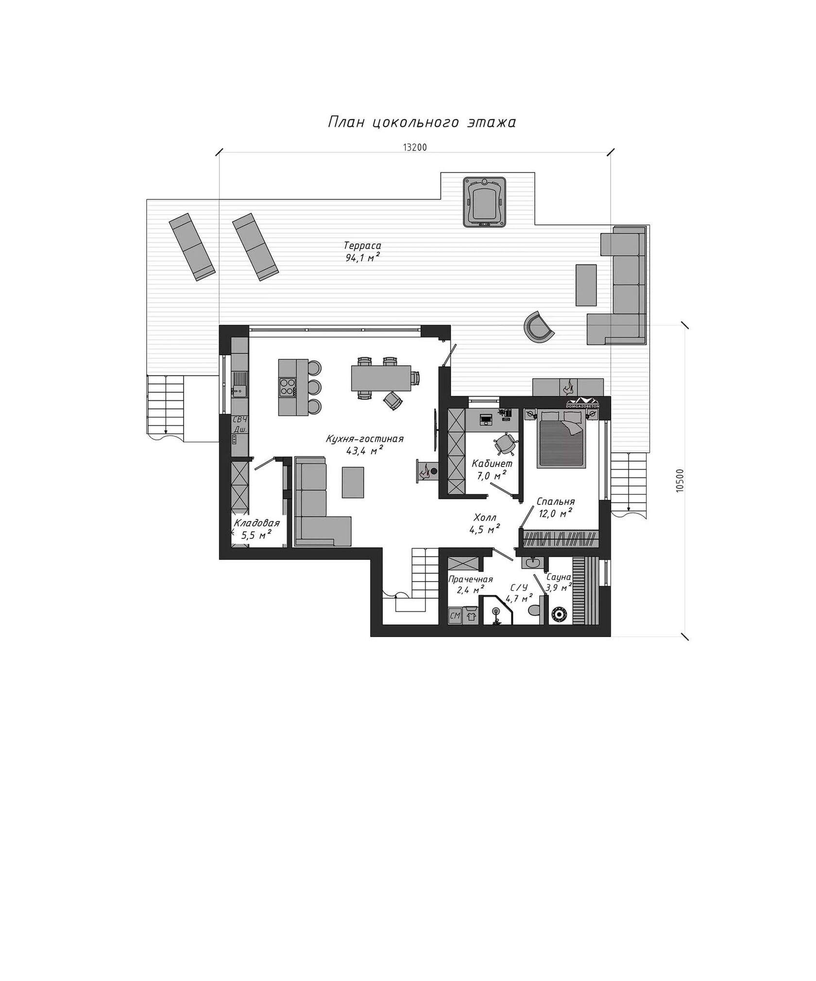 Проект одноэтажного дома в современном минималистическом стиле общей площадью 220м2 в коттеджном посёлке «Марсель» с комфортным цокольным решением для террасы с площадью 94,1м2
