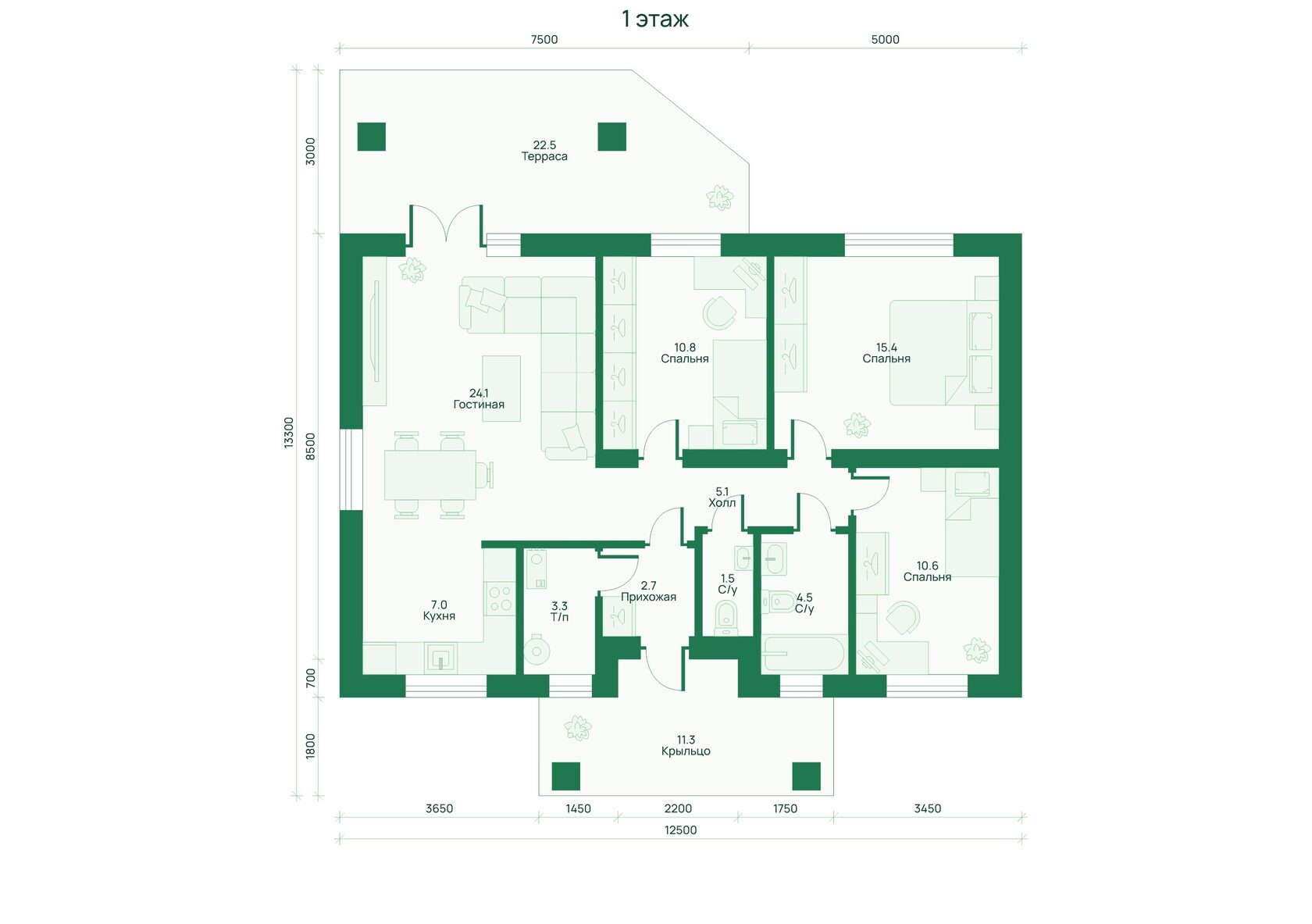 Архитектурно-планировочное решение: - На первом этаже располагаются терраса, гостиная, кухню, санузлы, холл и три спальни