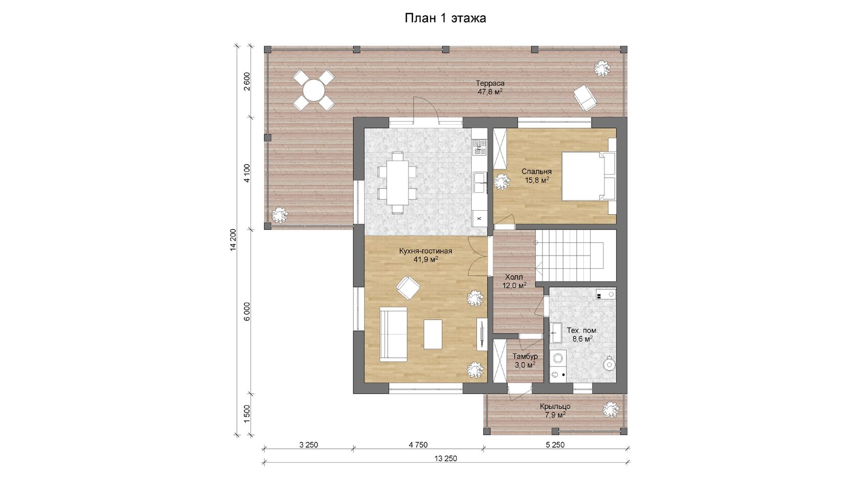Проект двухэтажного дома в современном стиле общей площадью 202м2 в коттеджном посёлке «Лисья горка» с террасой 47,8м2 и и вместительной кухней – гостиной площадью 41,9м2