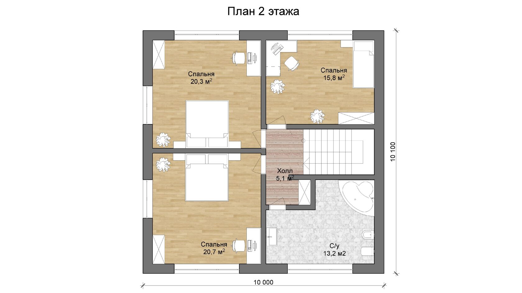Архитектурно-планировочное решение: - На первом этаже располагаются терраса, спальня, кухня гостиная, холл, тамбур, тех помещение и крыльцо - На втором этаже располагаются холл, санузел и три спальни