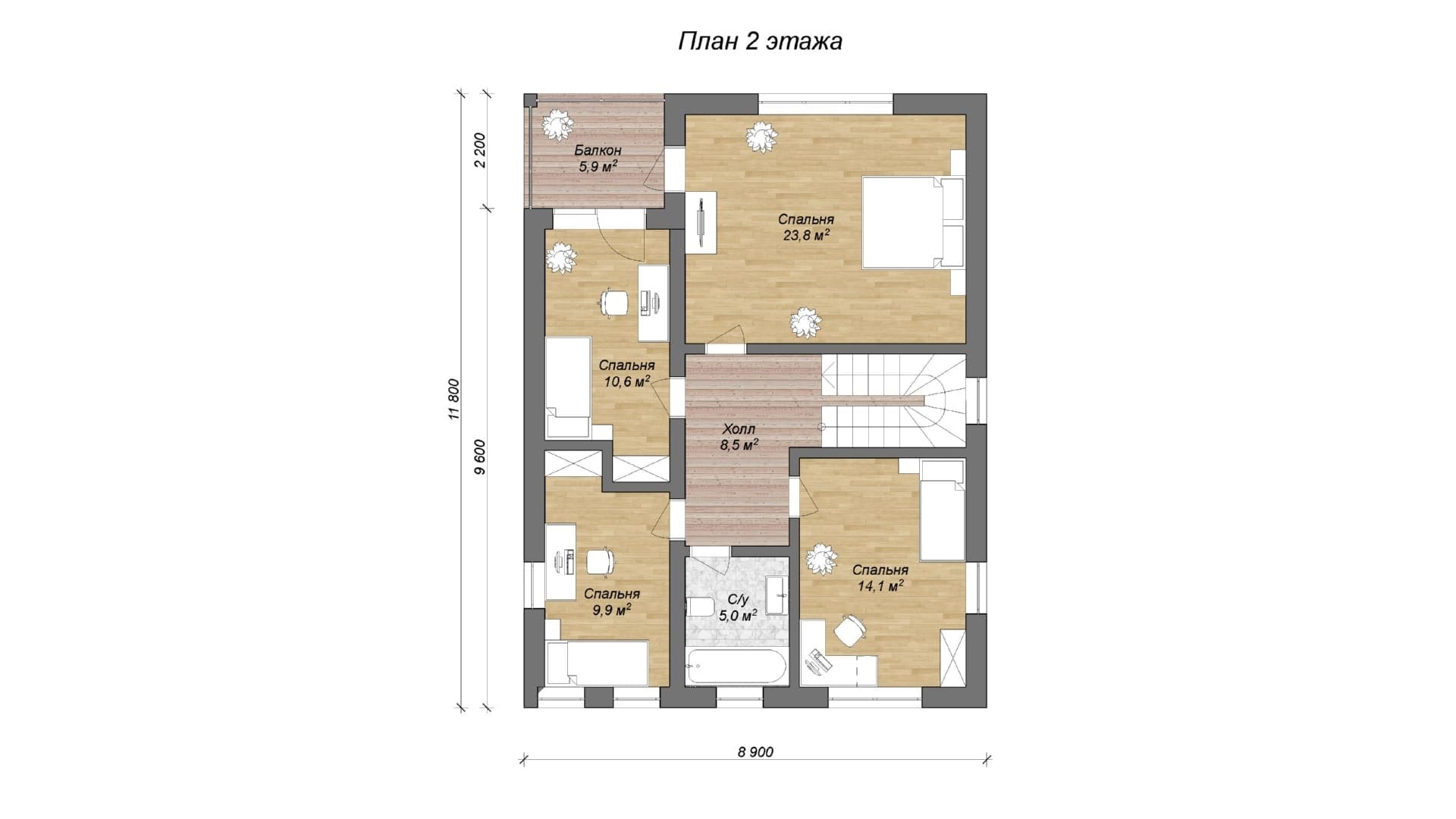 Архитектурно-планировочное решение: - На первом этаже располагаются терраса, гараж, кухня, гостиная, санузел, холл и кабинет - На втором этаже располагаются четыре спальни, холл и балкон, а также санузел