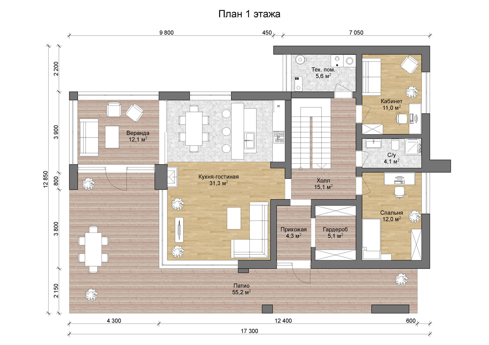 Проект двухэтажного дома в современном минималистическом стиле общей площадью 271м2 в коттеджном посёлке «Малыгино» с невероятной патио площадью 55,2м2 и кухней – гостиной площадью 31,3м2