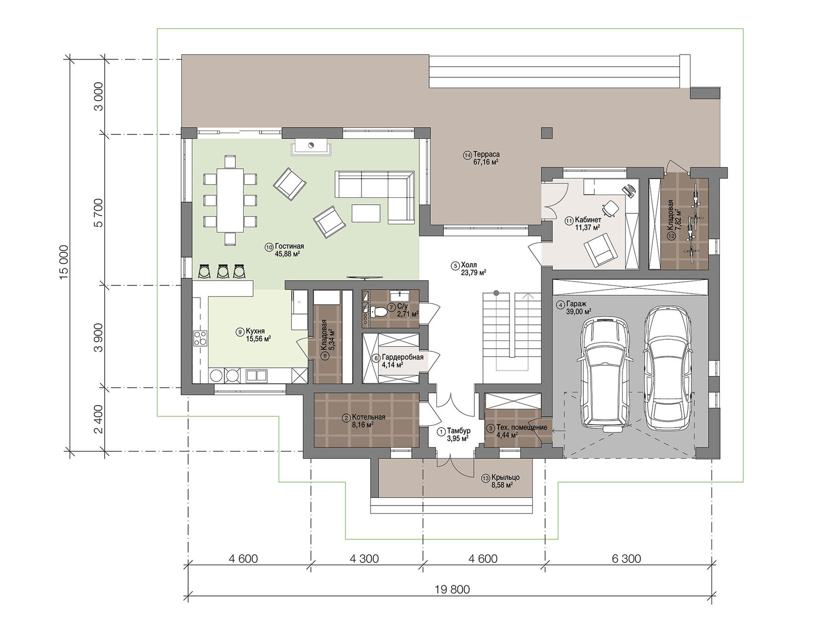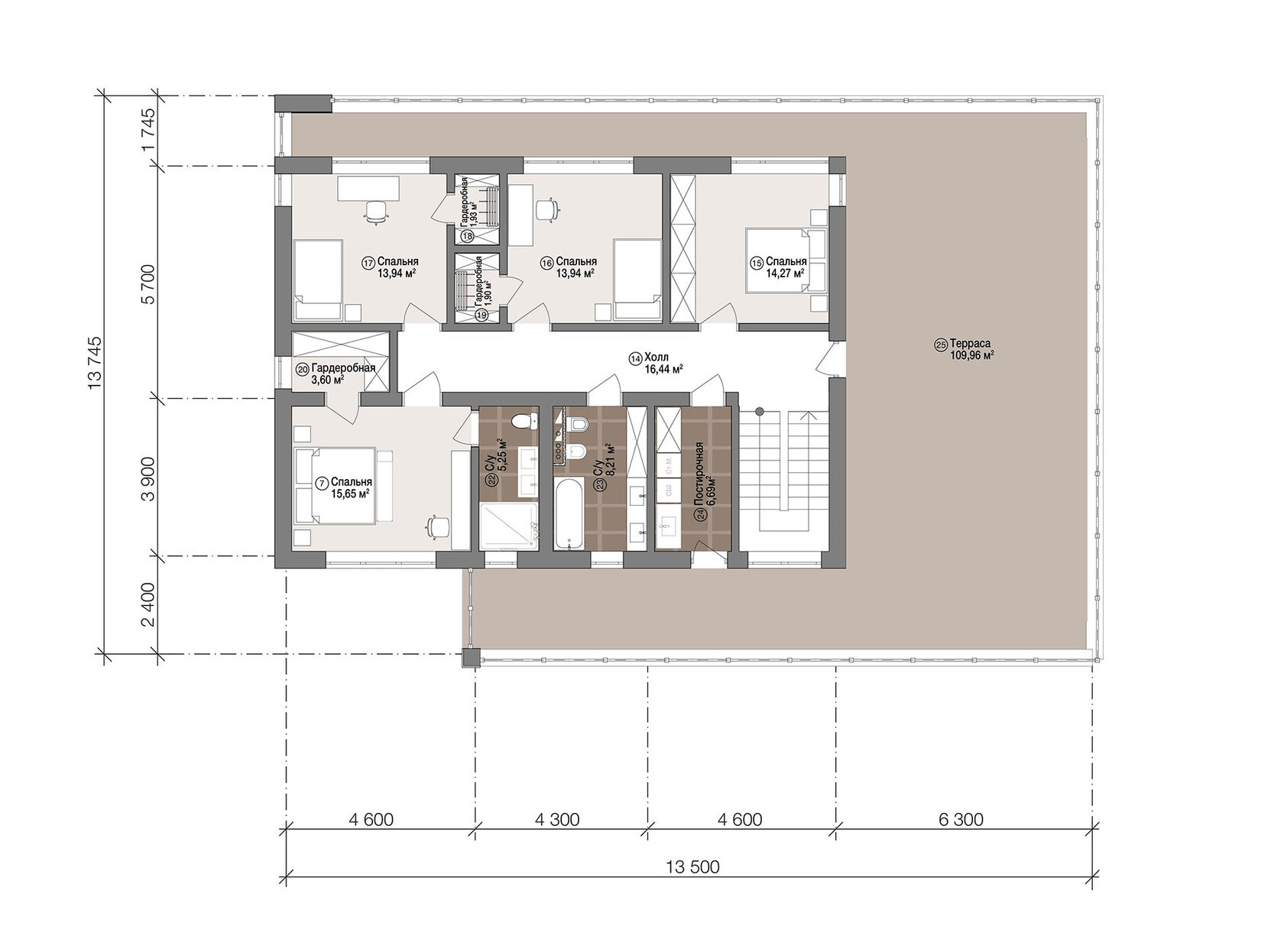 Проект двухэтажного дома в современном минималистическом стиле общей площадью 357м2 в коттеджном посёлке «Бурцево» с просторный гостиной и большим количеством спальных комнат на втором этаже. Также на втором этаже дома предусмотрено терраса площадью более 100м2