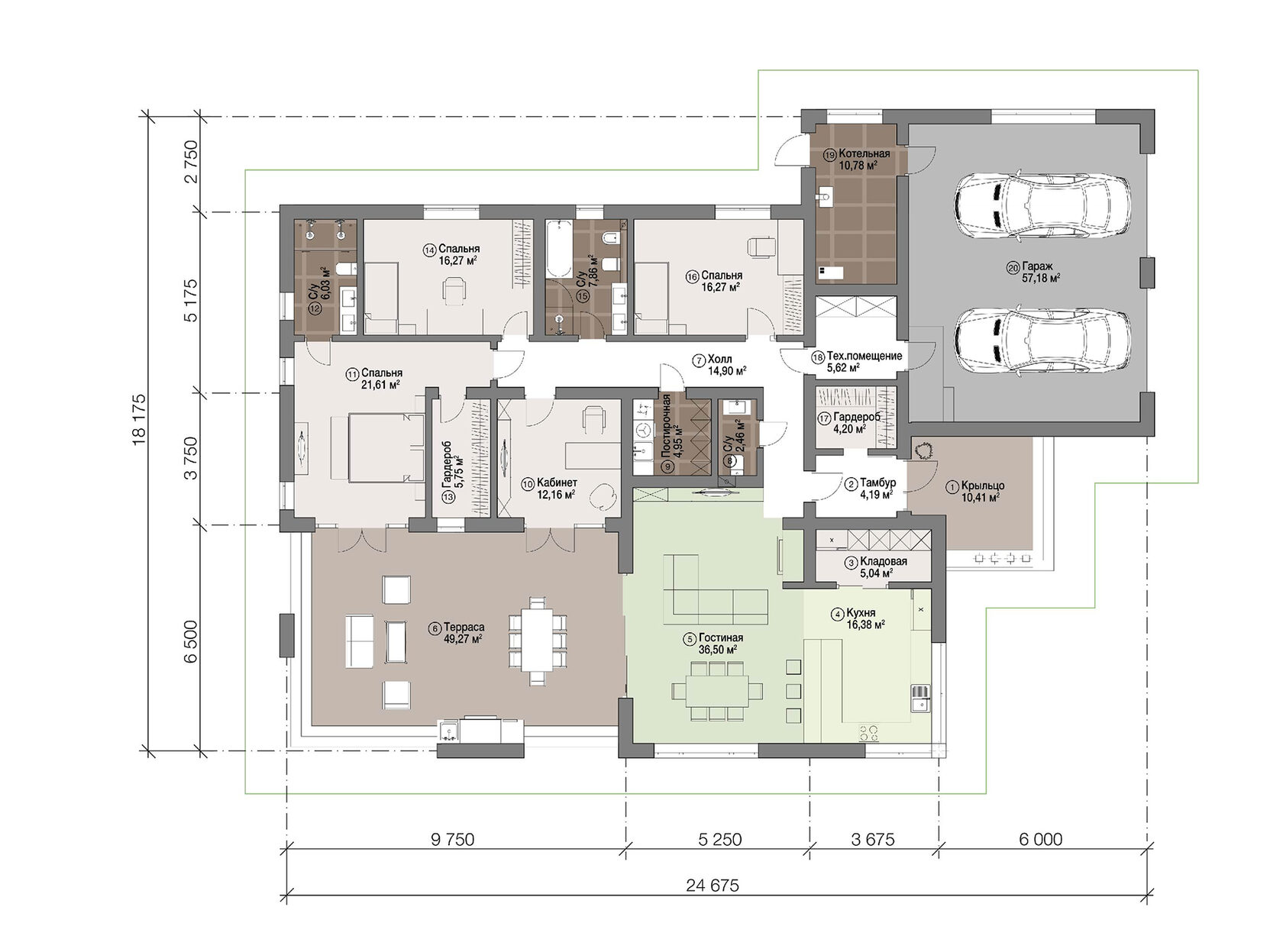 Проект одноэтажного дома в современном английском стиле общей площадью 361м2 в коттеджном посёлке «Тироль» с просторной планировкой для большой семьи и элегантными элементами фасада во внешнем дизайне