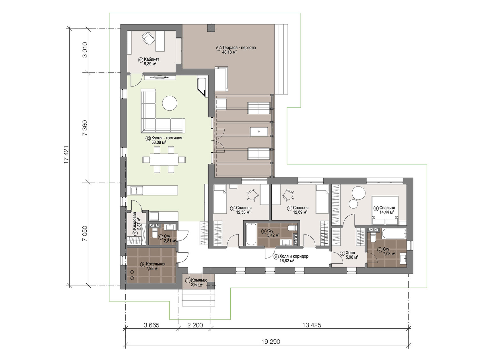 Проект одноэтажного дома в современном минималистическом стиле общей площадью 206м2 в коттеджном посёлке «Стольный» с тремя спальнями и кухней гостиной площадью 53,38м2