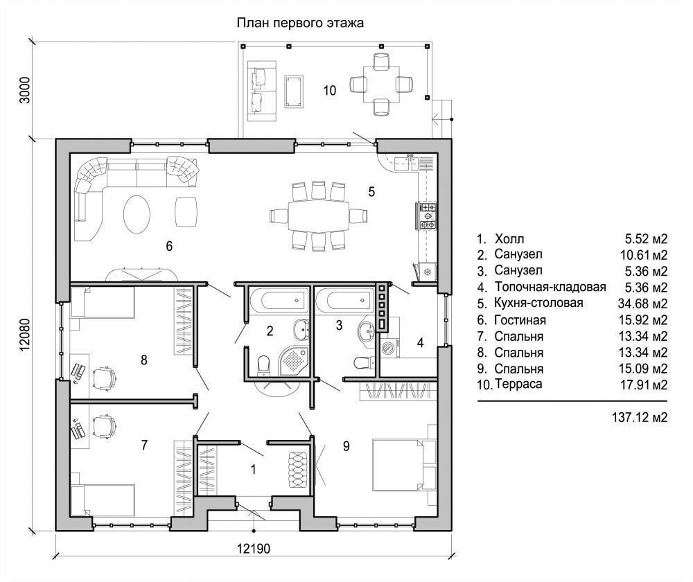На первом этаже распологаются холл, 2 санузла, топочная-кладовая, кухня-столовая, гостиная, 3 спальни, терасса.